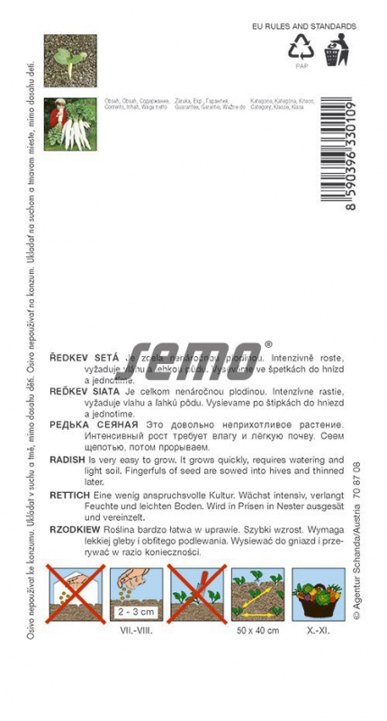 Sorte: RettichErste tschechische Sorte des Typs Daikon. Die Wurzeln sind zylindrisch, bis zu 40 cm lang, weiß. Das Fruchtfleisch ist weich, saftig und kompakt. Sie ist nicht anfällig für Pilzkrankheiten. Er hat ein kräftiges Wachstum und eine kurze Wachstumsperiode. Aufgrund ihrer langen Wurzeln benötigt sie einen leichteren, tiefgründigen und perfekt bearbeiteten Boden und bildet sehr gute Wurzeln, wenn sie in Erdhügeln angebaut wird. Im Juli-August in 50 × 30 cm große Nester säen, nach dem Auflaufen pro Pflanze aussäen. Sie lässt sich gut über den Winter lagern.