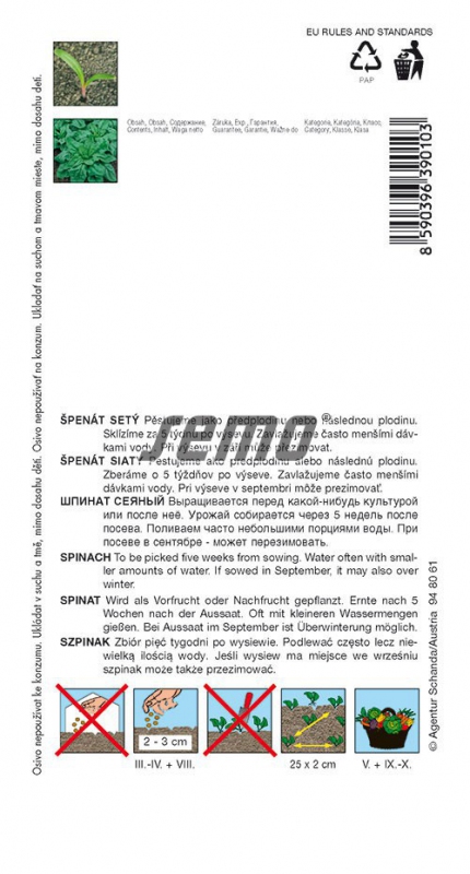 Sorte: SpinatSpäte Sorte, geeignet für Frühjahrs- und Herbsternte. Die Pflanze ist mittelstark bis stark mit halbaufrechten bis aufrechten Blättern. Diese sind oval mit einer abgerundeten Spitze, hellgrün, leicht blasig. Sie hat eine gute Frostbeständigkeit.