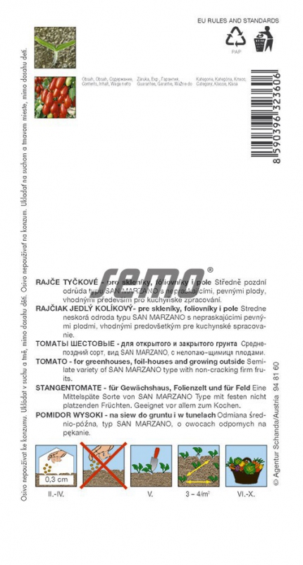 Sorte: TomateTomatensorte mit länglich-ovalen Früchten, die 130-150 g wiegen und für die Verarbeitung in der Küche oder für die Ketchup-Herstellung bestimmt sind. Die San Marzano-Sorten eignen sich sehr gut zum Kochen für Bolognesesaucen und dergleichen. Sie ist resistent gegen Verticillium und Fusarium oxysporum Ethnien 1 und 2.