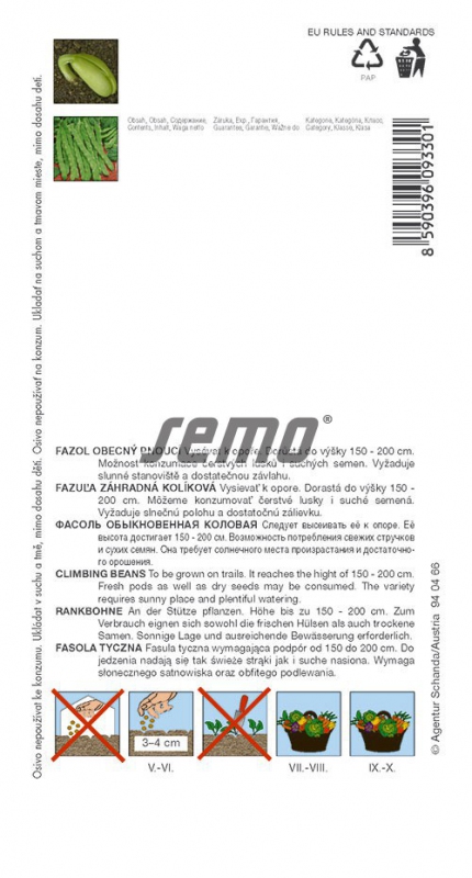 Sorte: BohnenEine Sorte von späten, stangenförmigen grünen Bohnen. Die Schoten sind vom Typ Supermarconi und werden bis zu 21 cm groß. Die Schoten sind sehr flach und grün. Die Samen sind flach, oval und von schwarzer Farbe. Die Bohnen sind für die Ernte von Schoten für den Frischverzehr und die Konservierung bestimmt.