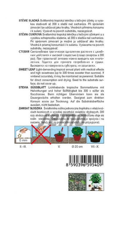Sorte: SteviaCompact Sweet ist eine weißblühende, lichtliebende, einjährige tropische Pflanze (kann bei richtiger Überwinterung als Staude gehalten werden), die bis zu 70 cm hoch wird und nachweislich medizinische Vorteile und eine hohe Süße (250 - 300 Mal süßer als Saccharose) aufweist. Die Substanz - das Glykosid - ist hitzestabil, verändert den pH-Wert nicht und gärt nicht.