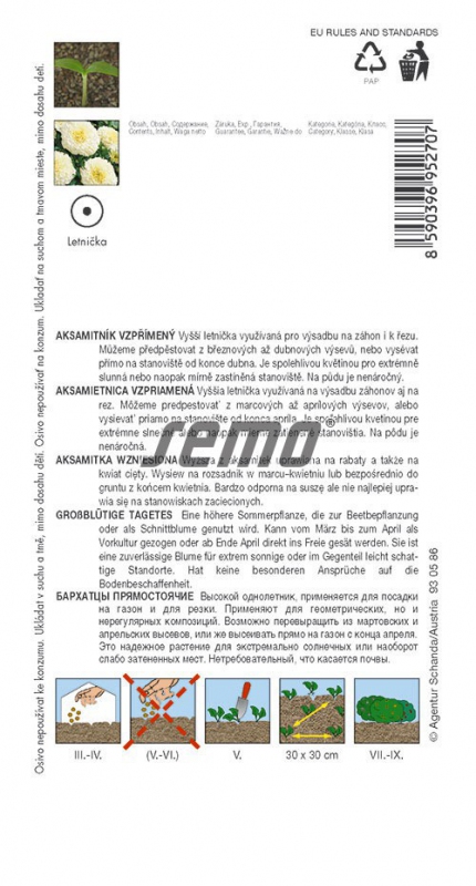 Sorte: TagetesGerade einjährige Pflanzen, die sich besonders für Beete und zum Schneiden eignen. In der Vase hält sie sich 10 Tage und länger. Cremeweiße, große, gefüllte Blüten, 45 cm hoch.