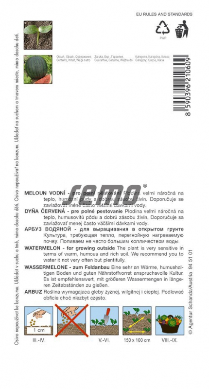Sorte: KürbisEine sehr frühe Sorte von Wassermelonen mit einer Wachstumszeit von 75-80 Tagen. Die Früchte wiegen 3-5 kg, fest, mit dunkelgrün gestreifter Schale. Das Fruchtfleisch ist tiefrot, ziemlich fest, sehr süß.