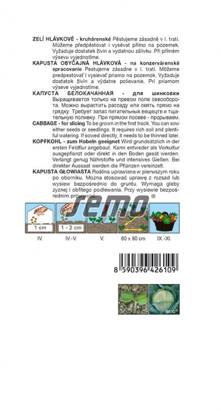 Sorte: KrautFusarium-resistenter Kohl. Ein sehr wüchsiger Typ, der große Köpfe mit feiner Textur und kurzem Strunk produziert. Eine sehr produktive Sorte, die sich hervorragend zum Reiben eignet. Die Wachstumszeit der Pflanzen ab der Pflanzung beträgt 102 Tage.