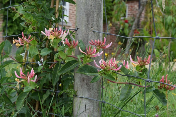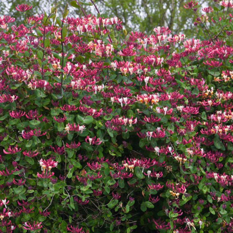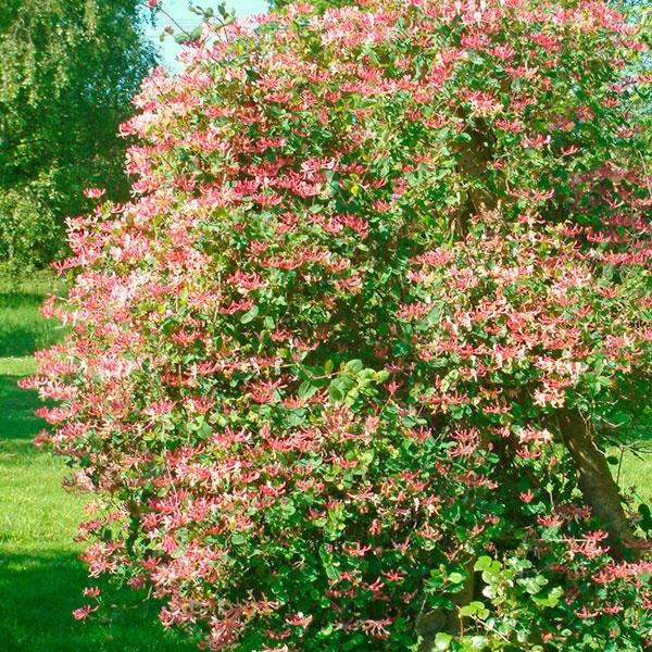 Ein sommergrüner, sommergrüner, lianenartiger Strauch, der 2-5 m hoch wird. Relativ dichte und regelmäßige Verzweigung. Blätter fast rund, 4-5 cm groß, dunkel- bis graugrün. Blüten röhrenförmig, innen cremeweiß, außen violett bis bordeauxrot. Die Blüten duften ausgesprochen süß, vor allem am Abend. Früchte purpurrot, 1-1,4 cm groß. Sie dienen als Vogelfutter.