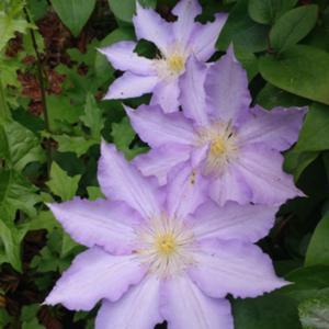 Clematis Thyrislund ist eine vollblütige und früh blühende Clematis. Die pastellfarbenen, hellvioletten, sternförmigen Blüten erreichen einen Durchmesser von 15 cm. Die kletternde, 200 cm hohe Clematis blüht schwer und üppig.