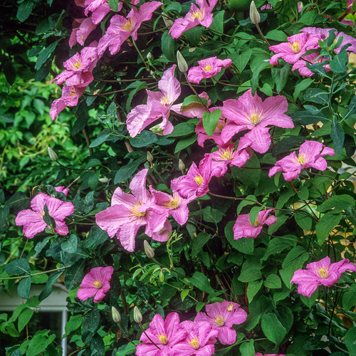 Clematis Comtesse de Bouchaud ist eine schöne, zarte, blassrosa Clematis mit einer einzelnen, mittelgroßen Blüte. Sie erscheinen im Frühsommer im ersten Schwung und nach einem leichten Schnitt im Spätsommer.