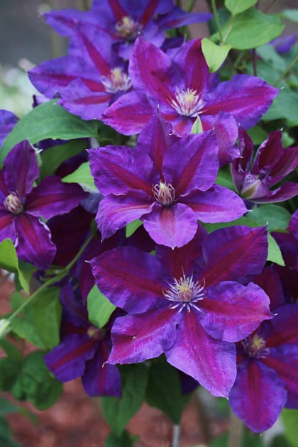 Clematis Julka ist eine großblütige Kletterclematis mit Blüten von bis zu 14 cm Durchmesser. Die Blütenblätter sind auffallend dunkel, bläulich-violett mit einem burgunderroten Band in der Mitte. Bei einigen Blüten kann die bordeauxrote Farbe dominieren. Die Mitte der Blüte ist hellgelb. Die Blüten dieser schönen Sorte erscheinen hauptsächlich in den Sommermonaten. Sie beginnt zu blühen, wenn sie eine Höhe von 100 cm erreicht hat, wird aber bis zu 200 cm hoch. Ideal für Halbschatten, ausgezeichnet in Kübeln.