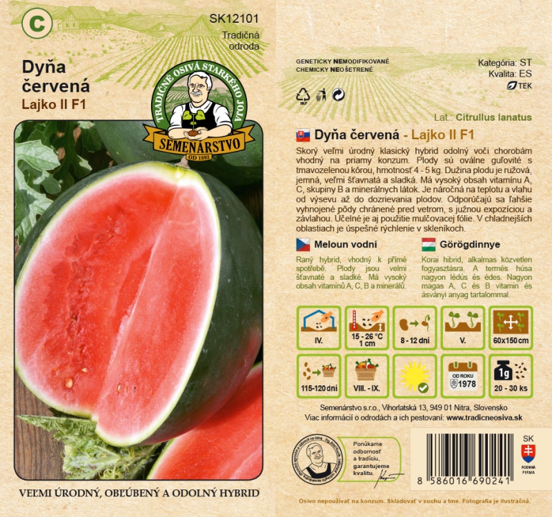 Sorte: KürbisSpäte, sehr fruchtbare, krankheitsresistente klassische Hybride, geeignet für den Direktverzehr. Die Früchte sind oval kugelförmig mit dunkelgrüner Schale, Gewicht 4 - 5 kg. Das Fruchtfleisch ist rosa, weich, sehr saftig und süß. Sie hat einen hohen Gehalt an Vitamin A, C, Gruppe B und Mineralien. Sie stellt hohe Ansprüche an Temperatur und Feuchtigkeit von der Aussaat bis zur Reife. Empfehlenswert sind leicht gedüngte, windgeschützte Böden mit Südlage und Bewässerung. Die Verwendung von Mulchfolien ist ebenfalls ratsam. In kälteren Gegenden ist die Anzucht im Gewächshaus erfolgreich.