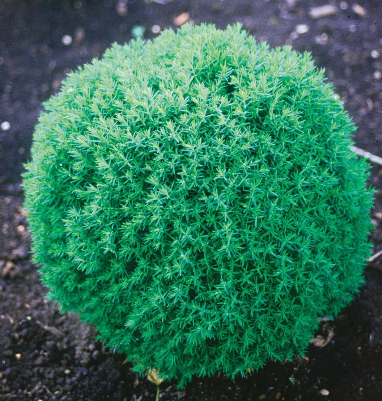 Eine dichte, zwergige, kugelförmige Pflanze mit weichen Nadeln.