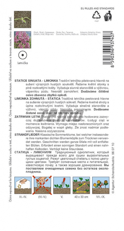 Sorte: Limonium latifoliumGerade, dicht verzweigte Einjährige, die hauptsächlich zum Trocknen verwendet werden. Bildet eine am Boden wachsende Rosette aus lanzettlich gelappten Blättern und kleinen Blüten in dichten Blütenständen an geflügelten Stängeln. Die Blütenstängel werden nach und nach geerntet (voll erblüht) und im Schatten getrocknet. Frische Blüten können auch zum Schneiden in Vasen verwendet werden. Sie benötigt einen vollsonnigen Standort und blüht schlecht im Halbschatten. Staunässe verträgt sie nicht. Rosa, Höhe 80 cm.