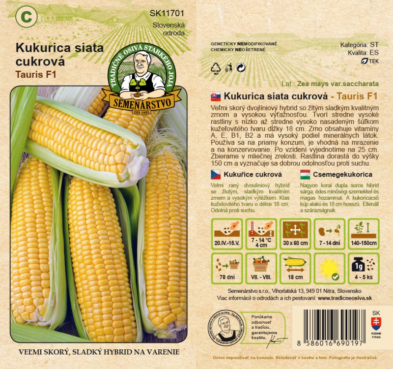 Sorte: MaisEine sehr frühe zweizeilige Hybride mit gelbem, süßem Qualitätskorn und hohem Ertrag. Bildet mittelhohe Pflanzen mit niedrigem bis mittelhohem Wuchs, kegelförmiger Stiel von 18 cm Länge. Das Korn enthält die Vitamine A, E, B1, B2 und hat einen hohen Mineralstoffgehalt. Es wird für den direkten Verzehr verwendet und eignet sich zum Einfrieren und Einmachen. Es wird bei Milchreife geerntet. Die Pflanze wird bis zu 150 cm hoch und zeichnet sich durch eine gute Trockenheitsresistenz aus.